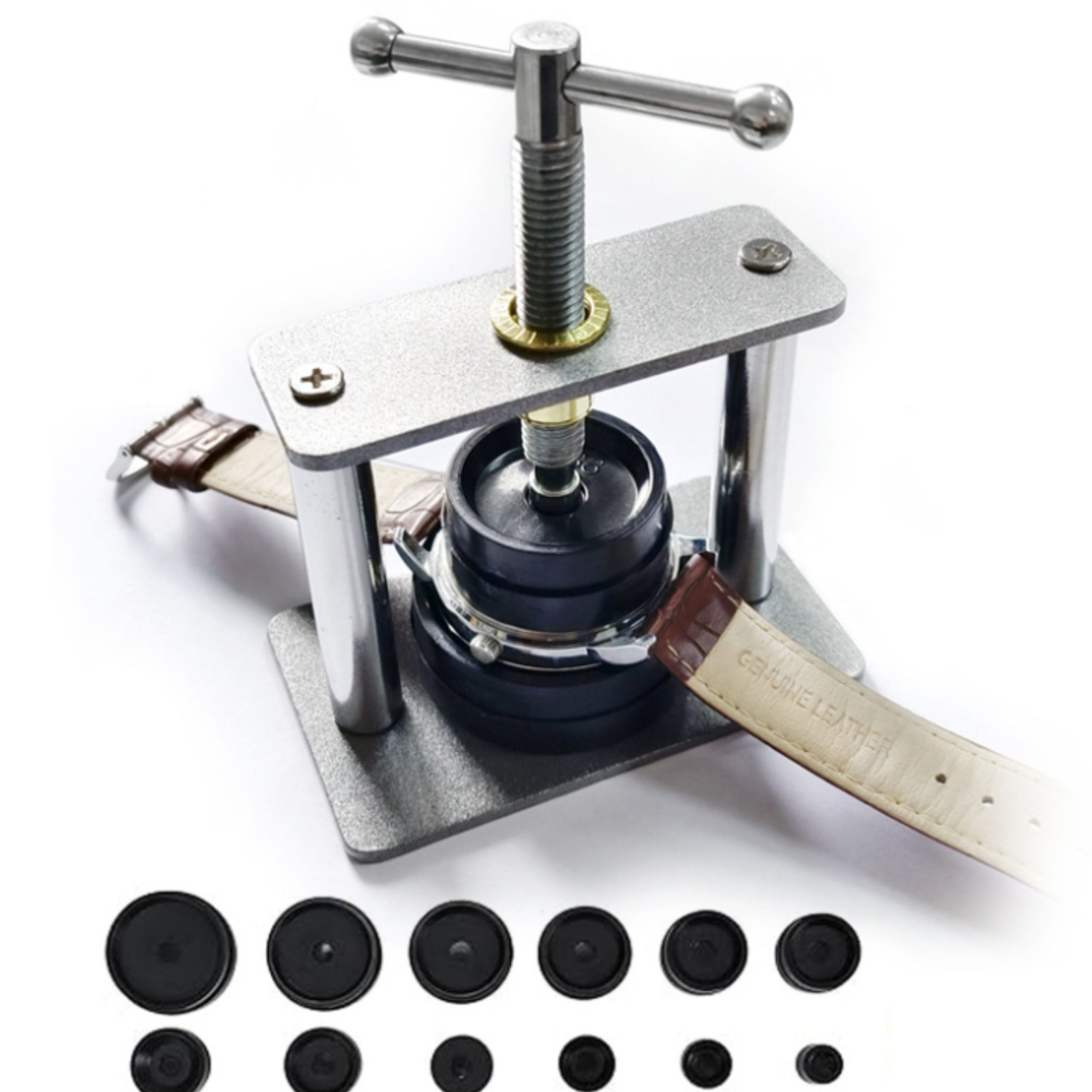 Máy dụng cụ ép đáy đồng hồ chuyên dụng với chất liệu thép trắng cao cấp chống gỉ, khuôn thép được đúc chắc chắn.