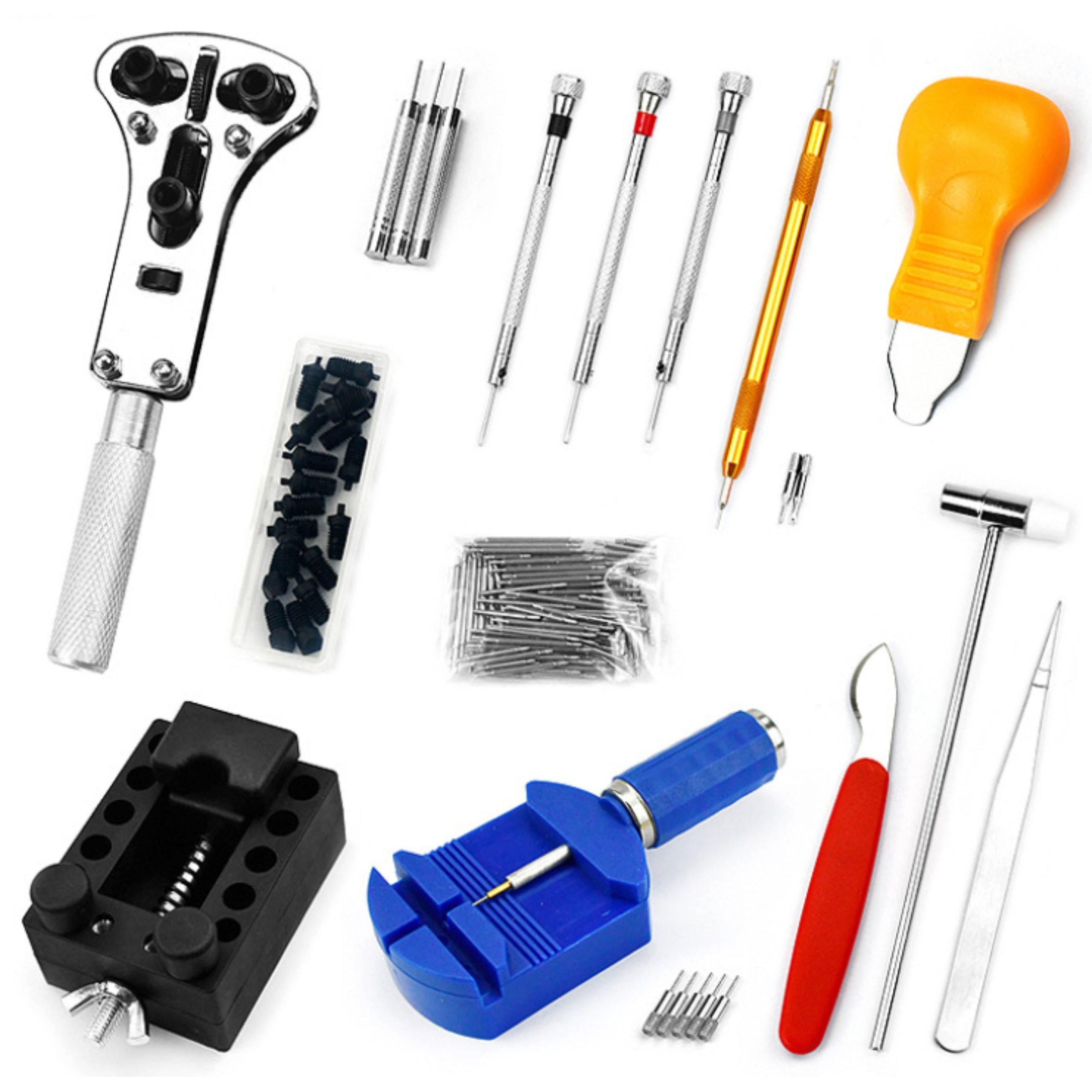 Các công cụ sửa chữa đồng hồ có thể bao gồm tua vít có rãnh và Phillips để tháo các ốc vít nhỏ, nhíp để xử lý pin và gắp các bộ phận, chốt lò xo để gắn dây đeo đồng hồ và dụng cụ tháo liên kết để định cỡ dây đeo đồng hồ bằng kim loại.