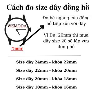 Size dây đồng hồ là chiều rộng của phần dây tiếp xúc với đồng hồ. Các size đồng hồ thông dụng 18mm, 19mm, 20mm, 21mm, 22mm, 24mm .