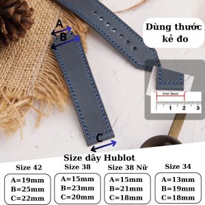 Bạn chưa biết chọn size dây hãy lướt tới ảnh cuối để xem cách đo – Bạn cũng có thể liện hệ với chúng tôi để được hướng dân cách đo size dây qua shop – Dây size 42 kích thước dây là: 19x26x22mm – Dây size 38 Nam kích thước dây là: 15x23x20mm – Dây size 38 nữ kích thước dây là: 15x21x18mm – Dây size 34 kích thước dây là: 13×20.5x18mm Lưu ý : Khi mua dây da cần đo chính xác thông số để lắp vừa đồng hồ . Size dây bao gồm 3 thông số A,B,C . Trong đó thông số bề ngang A và C bắt buộc phải chính xác thì lắp vừa đồng hồ và khóa .Cách đo -> Dùng thước kẻ đo bề ngang và đơn vị tính bằng MM
